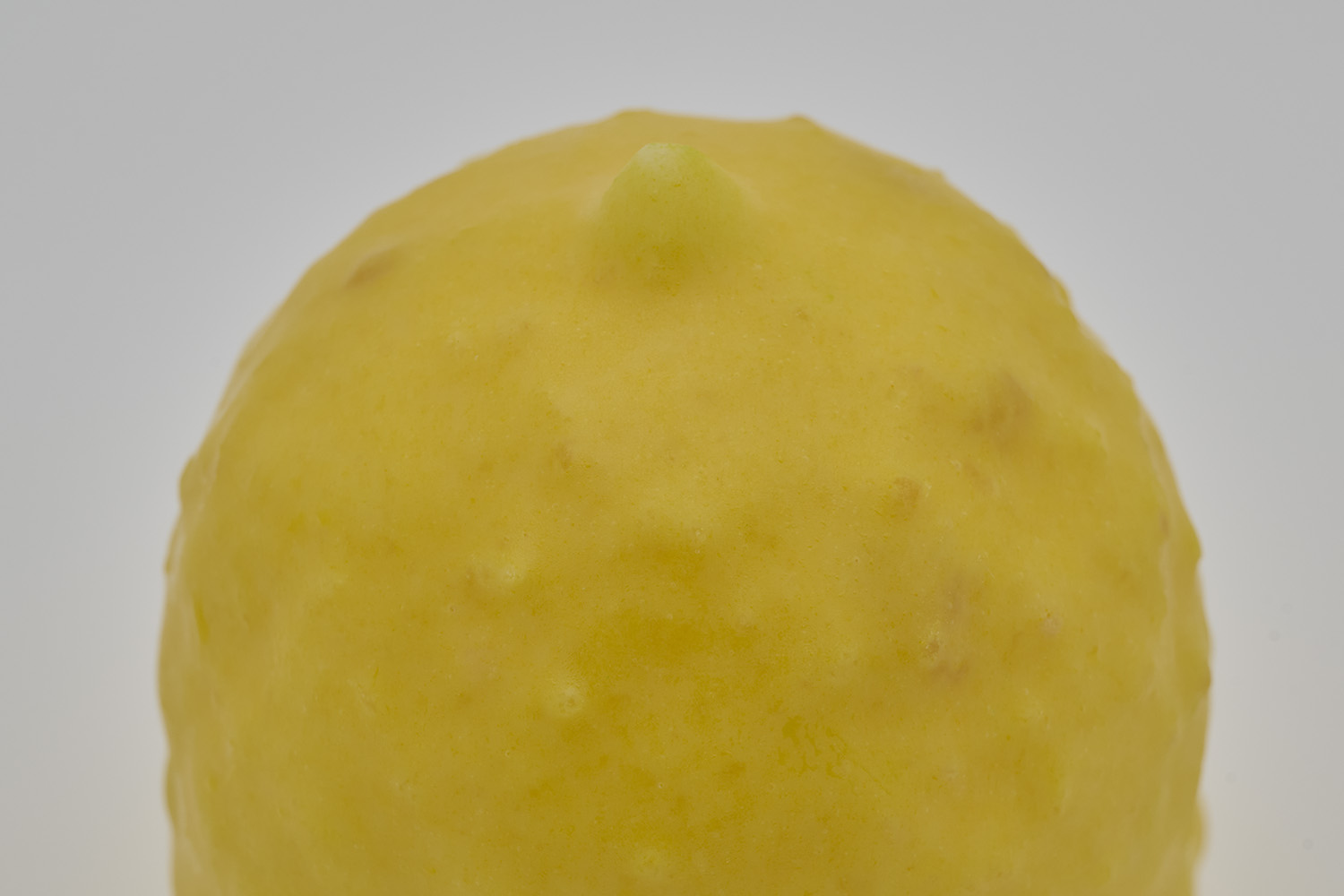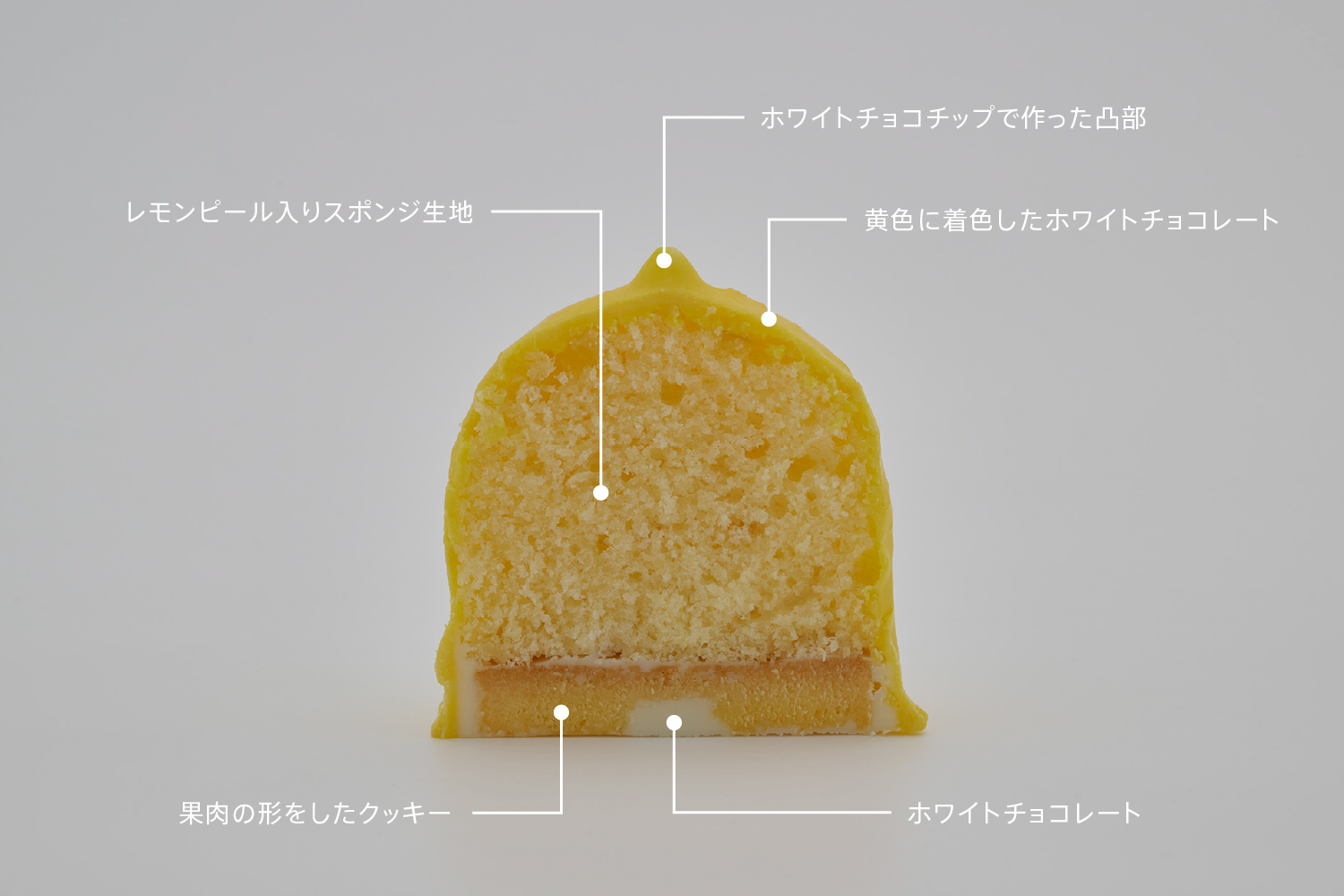 レモンの形において特徴的な凸部はホワイトチョコチップをスポンジ生地の上に乗せ、上から黄色に着色したチョコレートをかけることで再現しています。