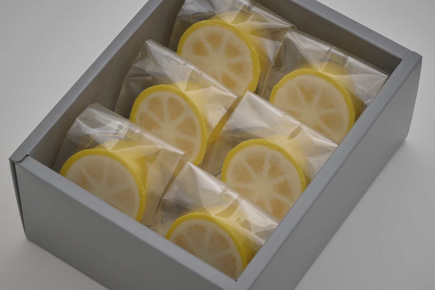 横方向にカットされたレモンを再現した、果肉が見えるレモンケーキです。
