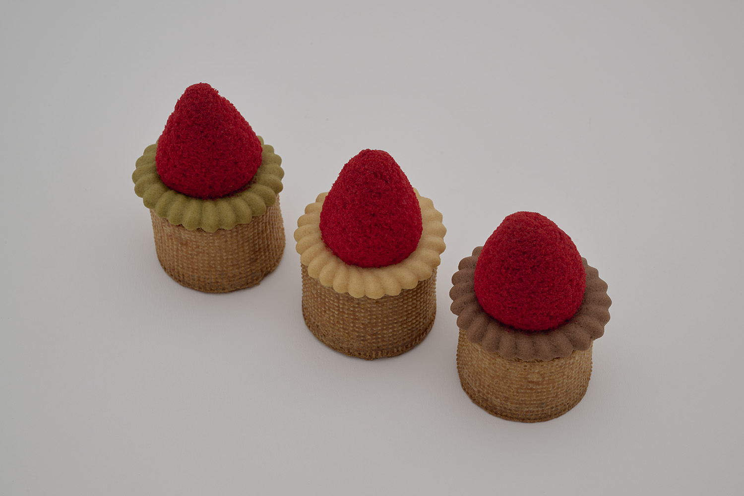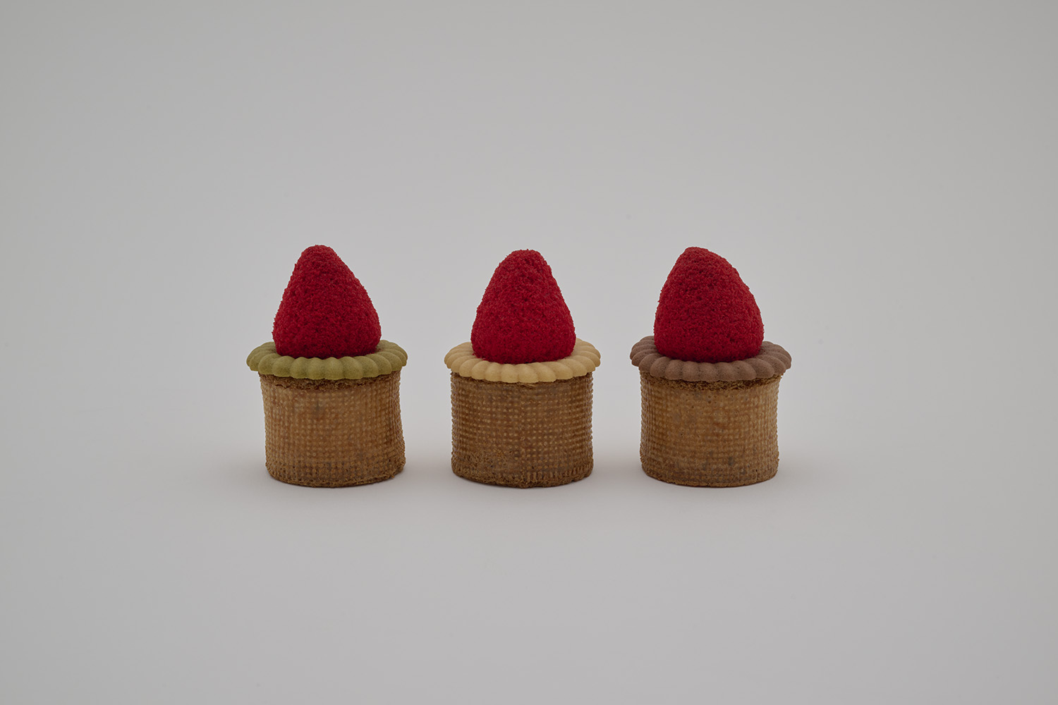 イチゴの形をしたラスク、クリームのようなクッキー、円柱形のシュー生地で構成されています。