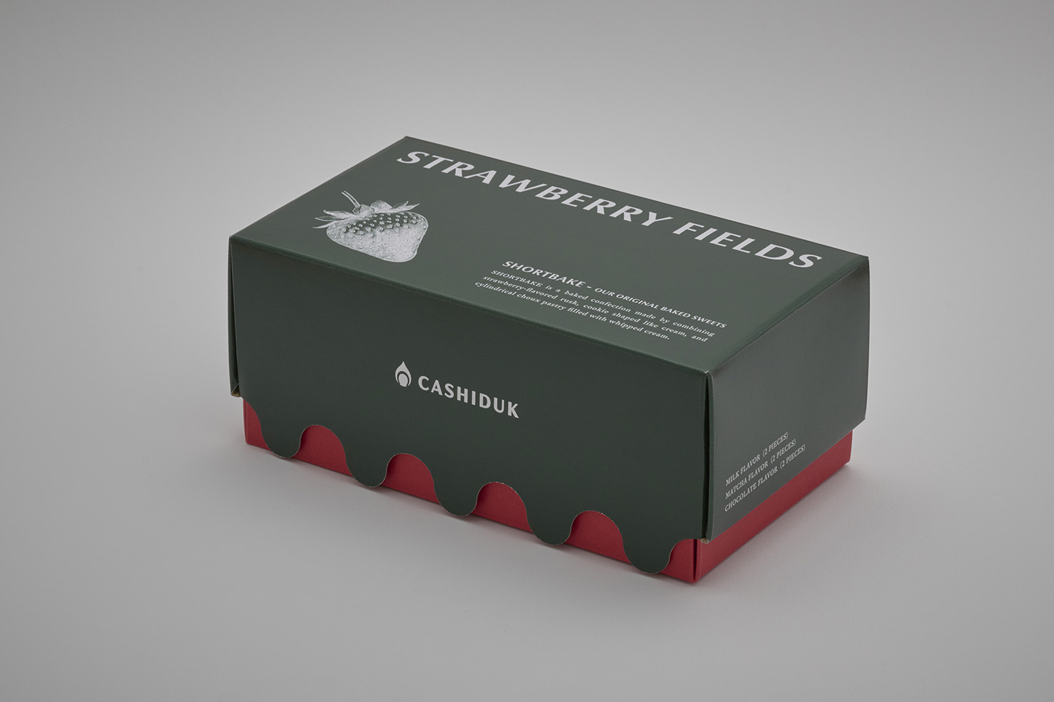 緑色の蓋の下部を波状にカットし、身の赤色が隙間から覗く形状をしています。これは緑緑しく生い茂る多くの葉と、その下に垂れ下がる赤いイチゴを表現しています。